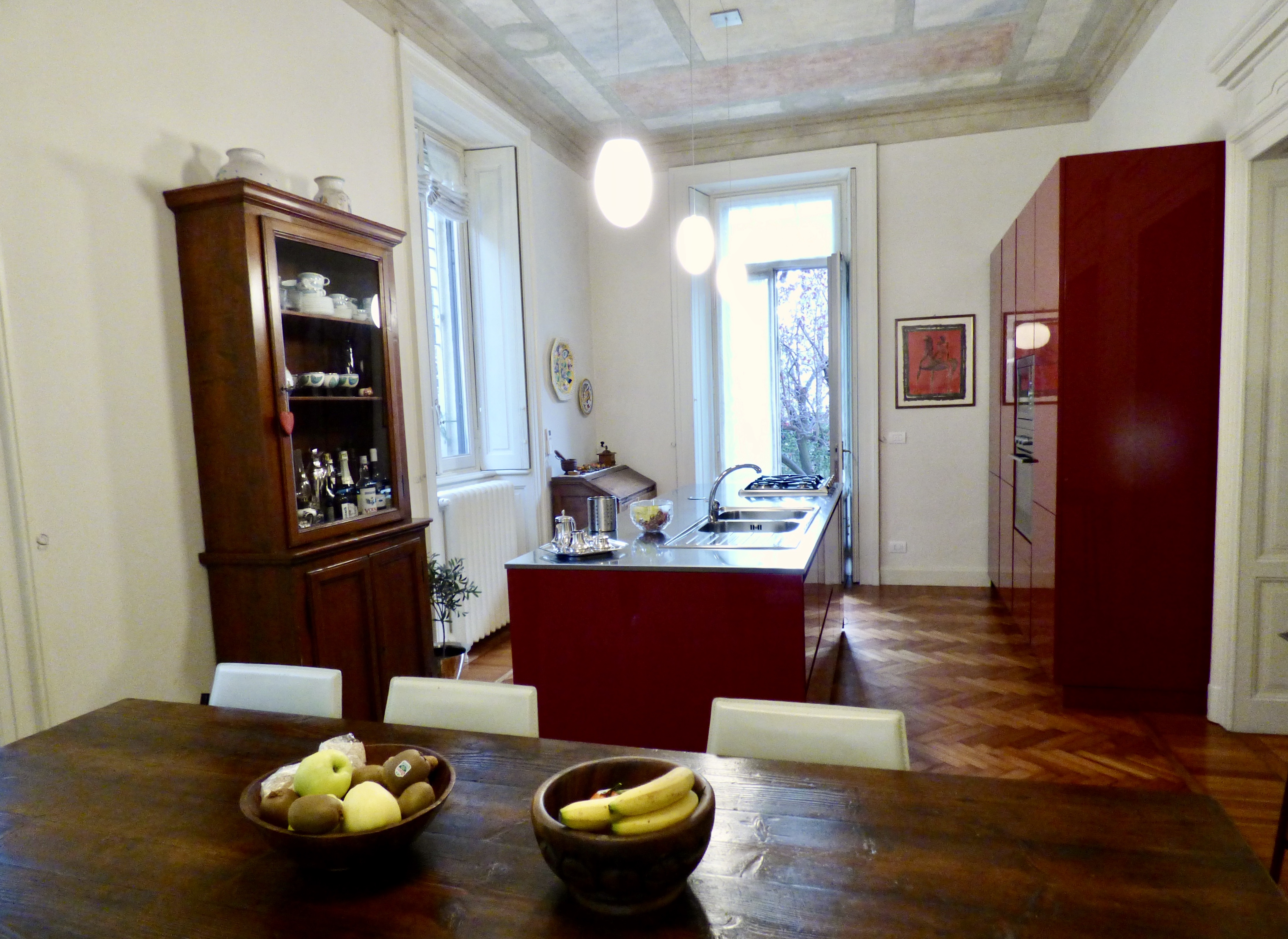Una cucina rossa affacciata su un giardino che riflette i fiori rosa del prunus in primavera e le foglie rosse in autunno in un riverbero di colori senza un confine tra il dentro e il fuori. Osare con l' allegria e i colori. Anche questo è Adele