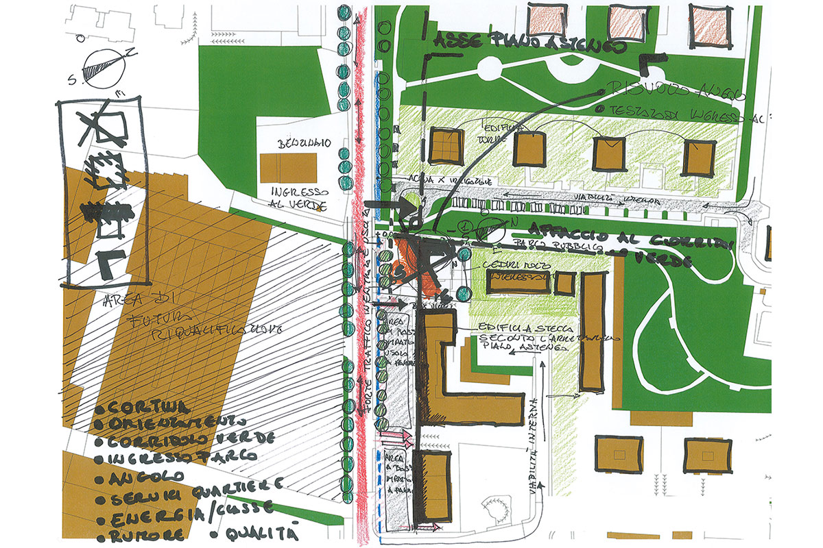 Il palazzo è situato su una delle direttrici di accesso alla città di Bergamo, caratterizzata da complessi edilizi di forte unitarietà e da corridoi verdi disposti perpendicolarmente in una zona in grande trasformazione. Il progetto è riuscito a riqualificare l’area e a migliorare l’accesso al corridoio verde di collegamento al parco pubblico.