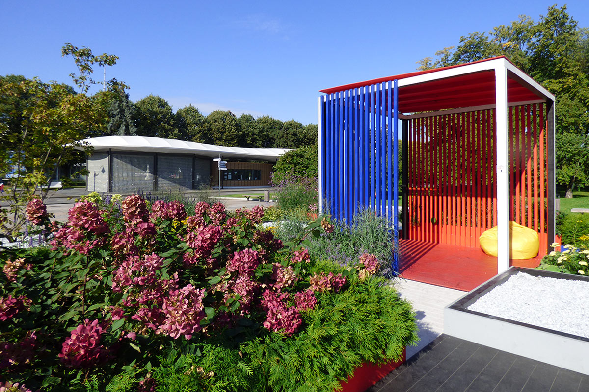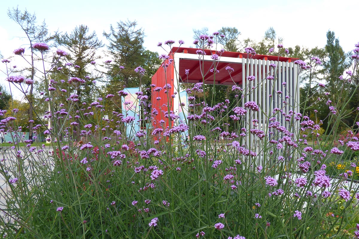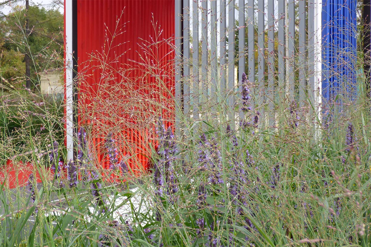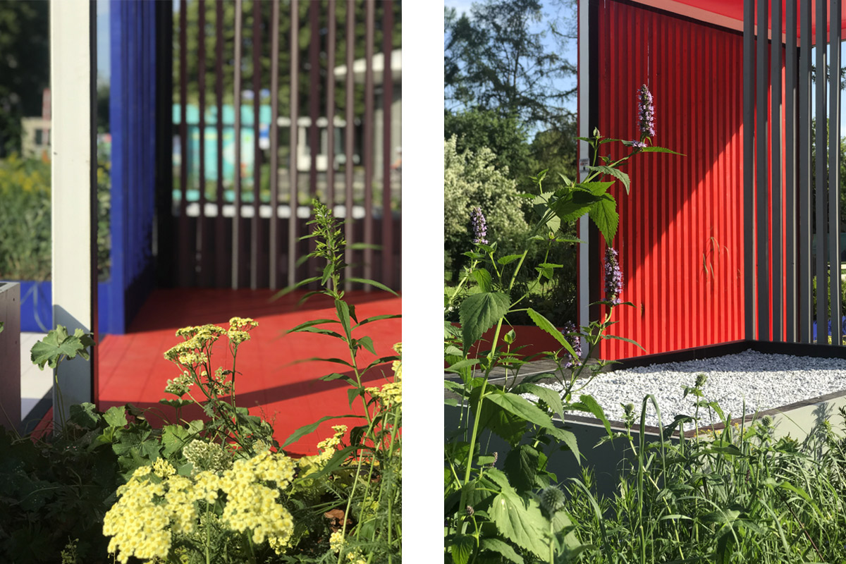 Le cromie delle specie vegetali scelte si accordano ai tre colori primari usati per dipingere le sponde delle fioriere. Il primo modulo quadrato da cui ha preso avvio la composizione contiene l’unico albero di progetto, un Acer ginnala, che con la sua evoluzione stagionale segna il passare del tempo, la quarta dimensione richiesta da concorso. In questa ottica di valorizzazione delle mutazioni stagionali sono scelte tutte le specie erbacee, fluttuanti nell’aria con il loro ritmo determinato dalle condizioni climatiche variabili nel tempo.