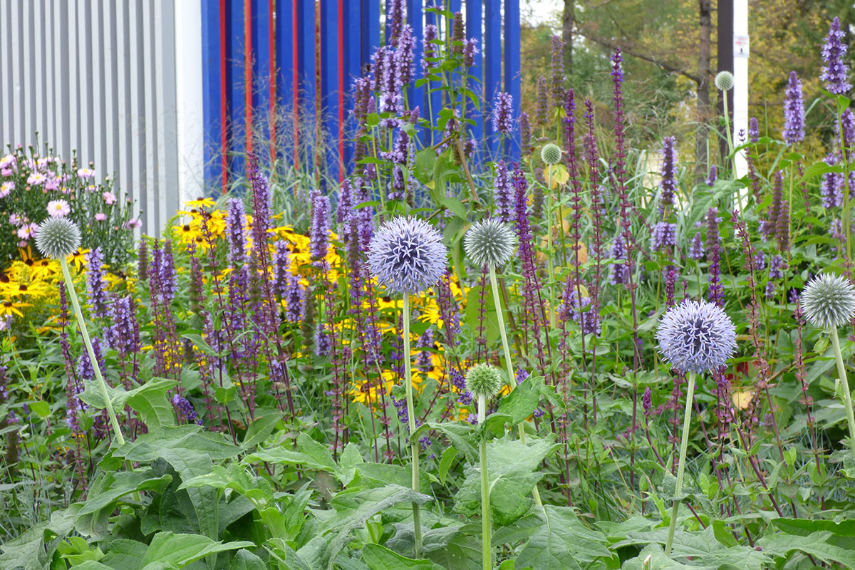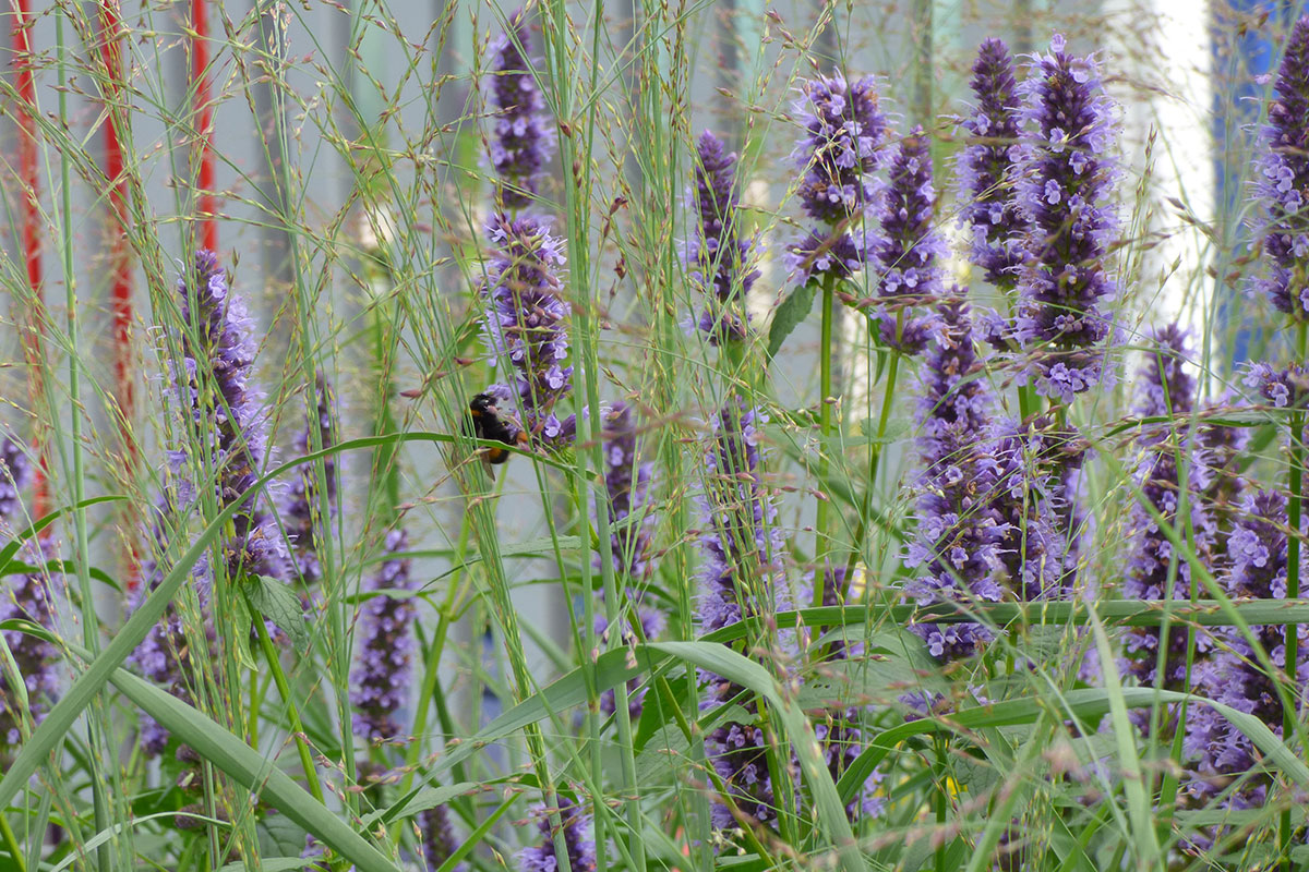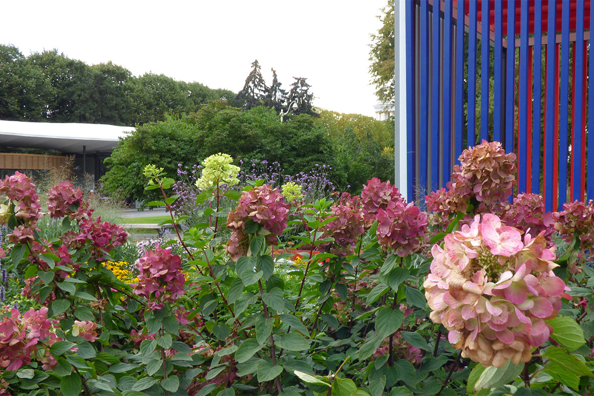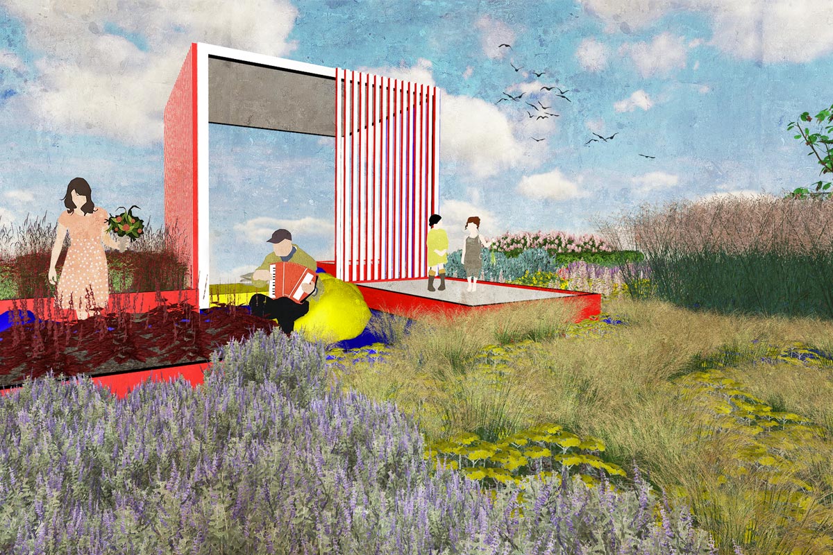 Le cromie delle specie vegetali scelte si accordano ai tre colori primari usati per dipingere le sponde delle fioriere. Il primo modulo quadrato da cui ha preso avvio la composizione contiene l’unico albero di progetto, un Acer ginnala, che con la sua evoluzione stagionale segna il passare del tempo, la quarta dimensione richiesta da concorso. In questa ottica di valorizzazione delle mutazioni stagionali sono scelte tutte le specie erbacee, fluttuanti nell’aria con il loro ritmo determinato dalle condizioni climatiche variabili nel tempo.