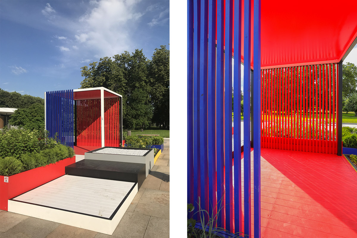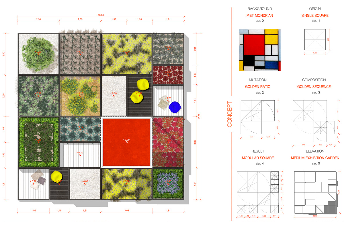 “Universal Rhythm” prende forma dalla lettura delle geometrie ortogonali presenti nelle opere di Piet Mondrian. Partendo da una forma quadrata con lato di 5 m, il progetto si estende con una successione modulare regolata dalla proporzione aurea fino a formare un quadrato più grande di 10 m di lato per una superficie di 100 mq. La geometria bidimensionale è stata infine sviluppata nella terza dimensione attribuendo diverse altezze ad ogni singolo modulo a formare fioriere e pedane sopraelevate a cui è associato un diverso colore primario: giallo-blu-rosso, mentre le pedane percorribili sono verniciate con colori neutri: bianco-grigio-nero.